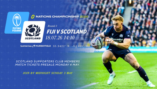 Scotland's Nations Championship match against Fiji has been confirmed as a 2:10pm kick-off on Saturday 18 July at Scottish Gas Murrayfield. Individual match tickets for this fixture go on sale this Tuesday 5 May.