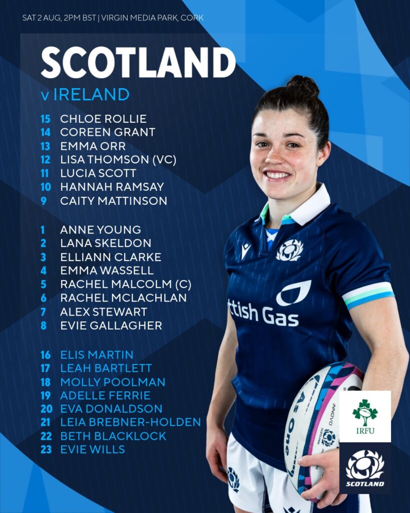 Scotland: 15. Chloe Rollie (Toulon Provence Mediterranee), 14. Coreen Grant (Saracens) 13. Emma Orr (Bristol Bears) (Sale Sharks) 12. Lisa Thomson (Trailfinders Women) 11. Lucia Scott (Loughborough Lightning) 10. Hannah Ramsay (Edinburgh Rugby/University of Edinburgh) 9. Caity Mattinson (Trailfinders Women) 1. Anne Young (Loughborough Lightning) 2. Lana Skeldon (Bristol Bears) 3. Elliann Clarke (Bristol Bears) 4. Emma Wassell (Trailfinders Women) 5. Rachel Malcolm – Captain (Trailfinders Women) 6. Rachel McLachlan (Montpellier) 7. Alex Stewart (Edinburgh Rugby/Corstorphine Cougars) 8. Evie Gallagher (Bristol Bears)