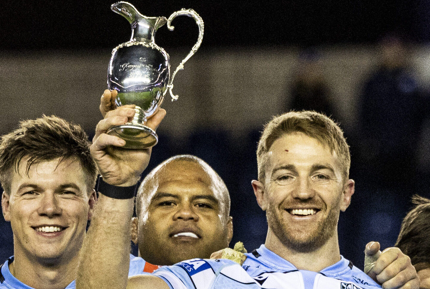 EDINBURGH, SCOTLAND - DECEMBER 28: Warriors' Kyle Steyn lifts the 1872 Cup during a United Rugby Championship match between Edinburgh Rugby and Glasgow Warriors at Scottish Gas Murrayfield, on December 28, 2024, in Edinburgh, Scotland. Glasgow left their home leg at Hampden Park with a 19-point lead thanks to their 33-14 win before Christmas. And although the Gunners did win at Scottish Gas Murrayfield in the second leg, it wasn’t enough to overturn the deficit, and the Warriors lifted the Cup.