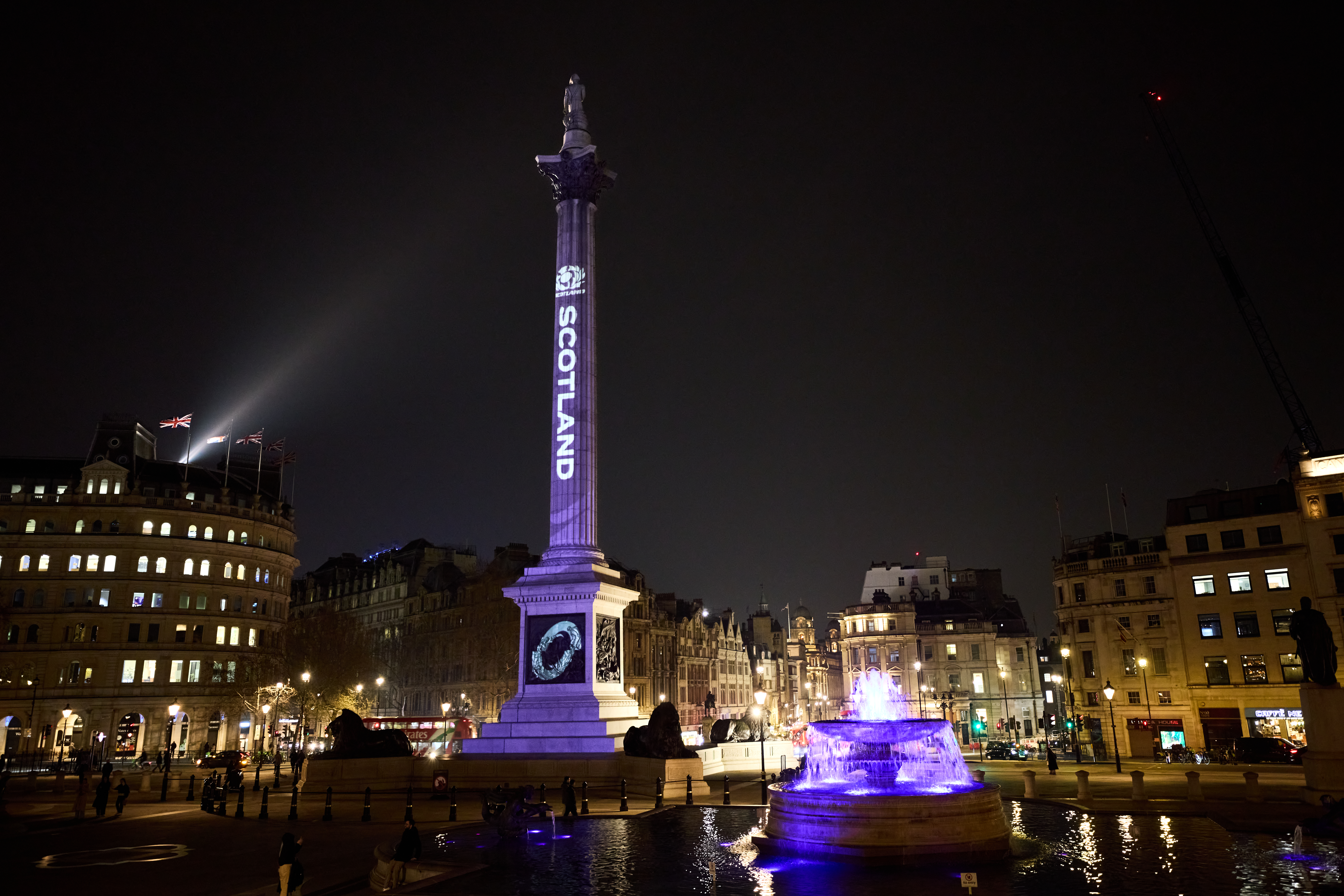 LONDON, ENGLAND - MARCH 23: A general view as Nelson's Column is lit up for Scotland to mark 100 days until rugby union's newest global competition, Nations Championship begins at Trafalgar Square on March 23, 2026 in London, England. All roads lead to London as the inaugural Finals Weekend is held at Twickenham's Allianz Stadium in November 2026. (Photo by Karl Bridgeman/Getty Images for Nations Championship)