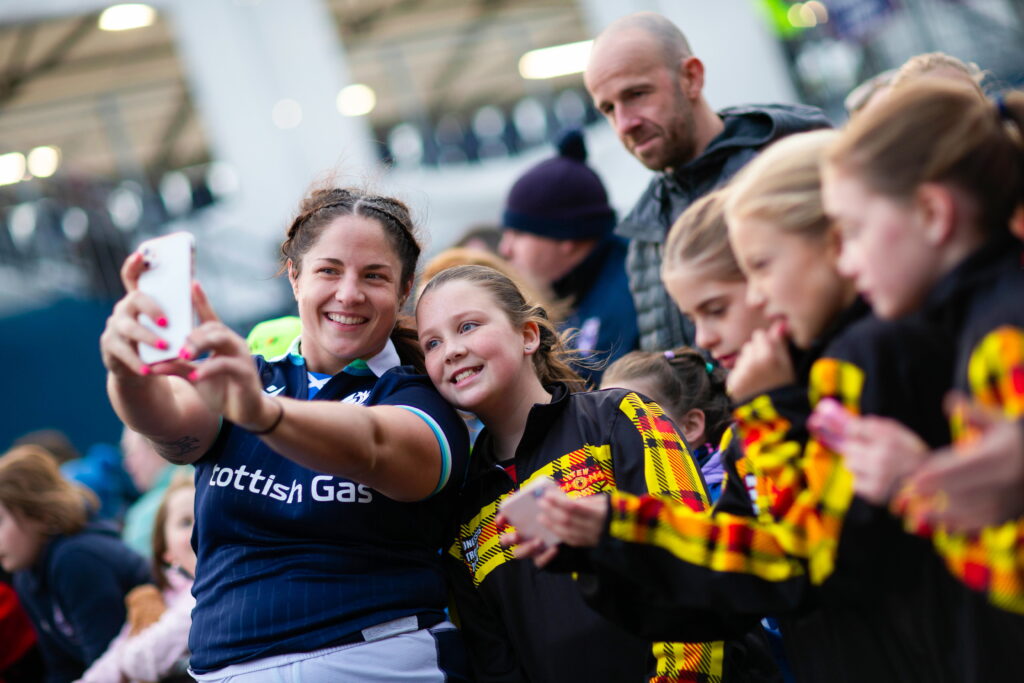 EDINBURGH, SCOTLAND – SEPTEMBER 14: Scotland’s Christine Belisle with fans at full time during an Autumn Test match between Scotland Women and Fiji at Hive Stadium, on September 14, 2024, in Edinburgh, Scotland. (Photo by Ewan Bootman / SNS Group)
