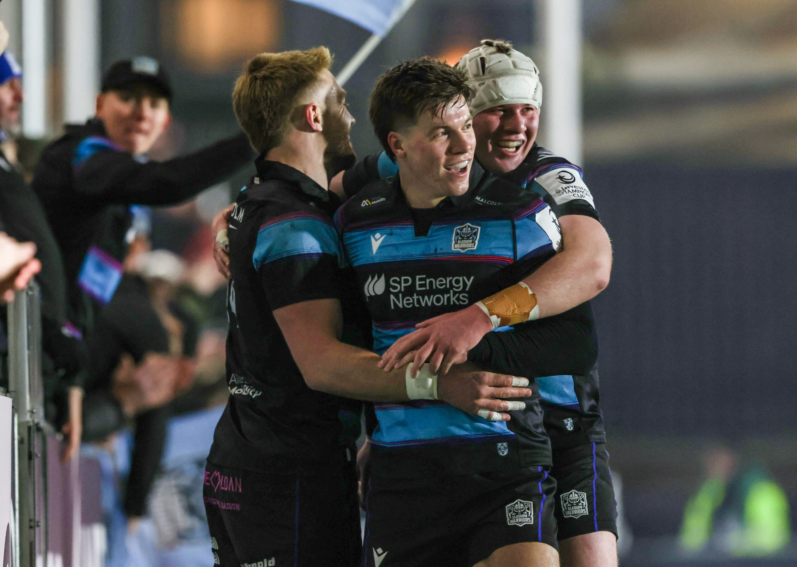 GLASGOW, SCOTLAND - JANUARY 18: Warriors' Kyle Steyn (L) celebrates with Huw Jones (C) and Gregor Hiddleston (R) after scoring a first half try during a 2025/26 Investec Champions Cup Round 4 match between Glasgow Warriors and Saracens at Scotstoun Stadium, on January 18, 2026, in Glasgow, Scotland. (Photo by Craig Williamson / SNS Group) Glasgow Warriors will host the Vodacom Bulls at Scotstoun Stadium in the Round of 16 of the Investec Champions Cup on Saturday 4 April 2026, with a 5.30pm kick-off confirmed.