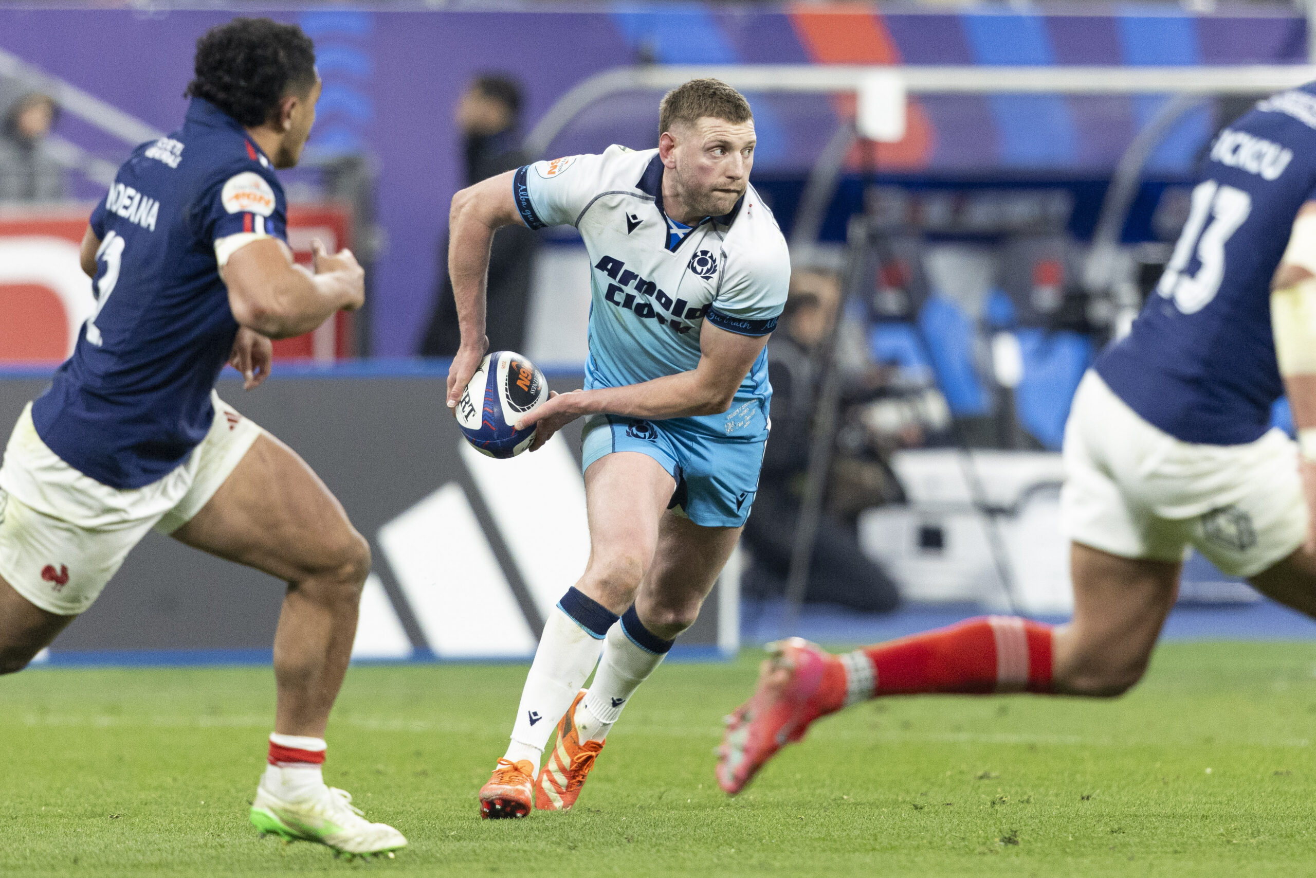 PARIS, FRANCE - MARCH 15: Scotlands Finn Russell in action during a Guinness Six Nations match between France and Scotland at the Stade de France, on March 15, 2025, in Paris, France. (Photo by Ross MacDonald / SNS Group)