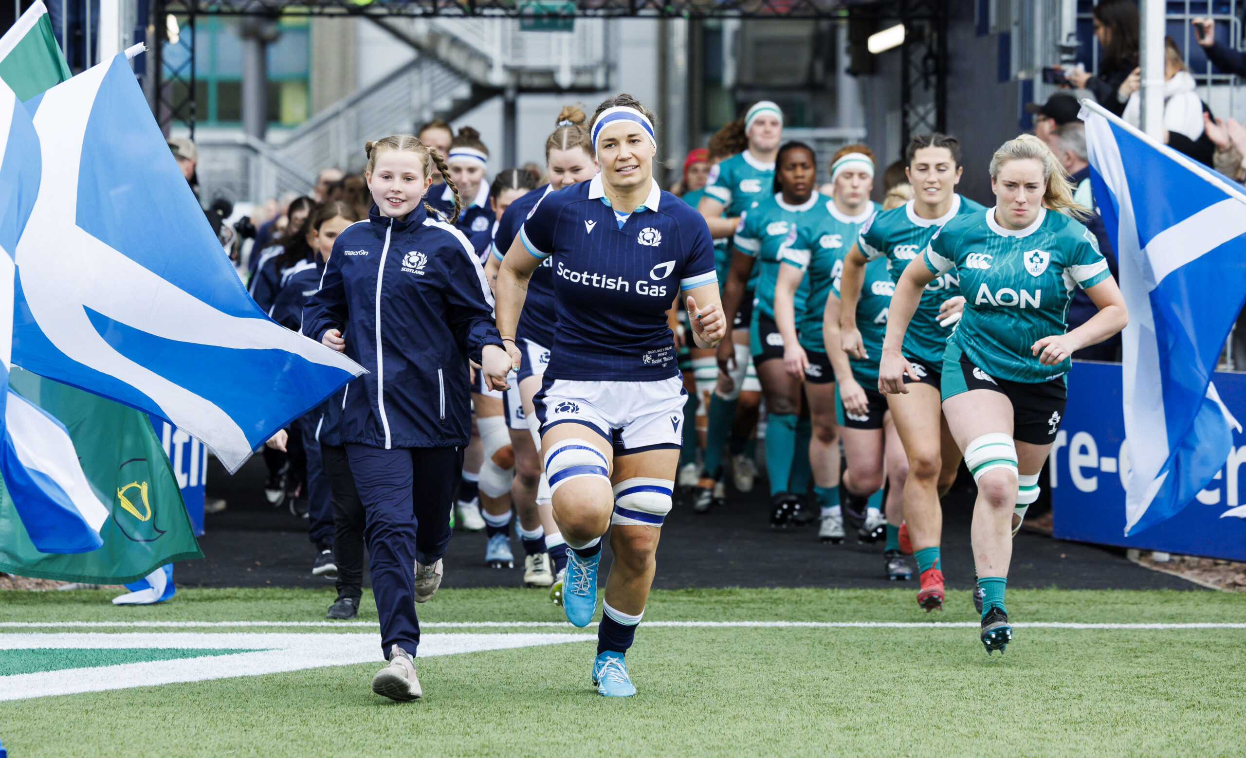 EDINBURGH, SCOTLAND - APRIL 26: Scotland's Rachel Malcolm runs out onto the pitch alongside a mascot ahead of a Guinness Women's Six Nations match between Scotland and Ireland at The Hive Stadium, on April 26, 2025, in Edinburgh, Scotland. (Photo by Mark Scates / SNS Group)
