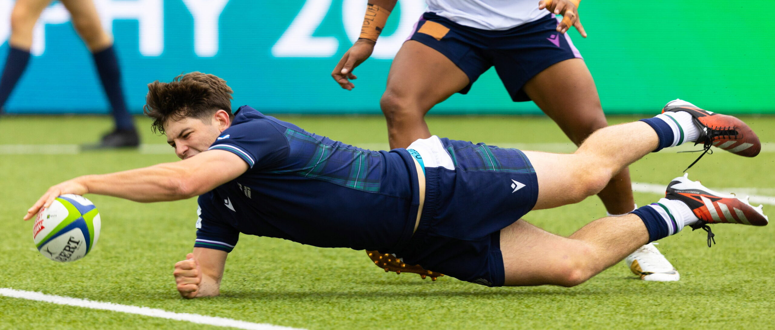 EDINBURGH, SCOTLAND - JULY 02: Scotland's Findlay Doyle scores a try during a World Rugby U20 Trophy 2024 match between Scotland and Samoa at the Hive Stadium, on July 02, 2024, in Edinburgh, Scotland. (Photo by Ross Parker / SNS Group) Head Coach Kenny Murray said: “With the nature of this tournament and the short turnaround between matches, it is important that we are able to use the full squad and that everyone can step up.