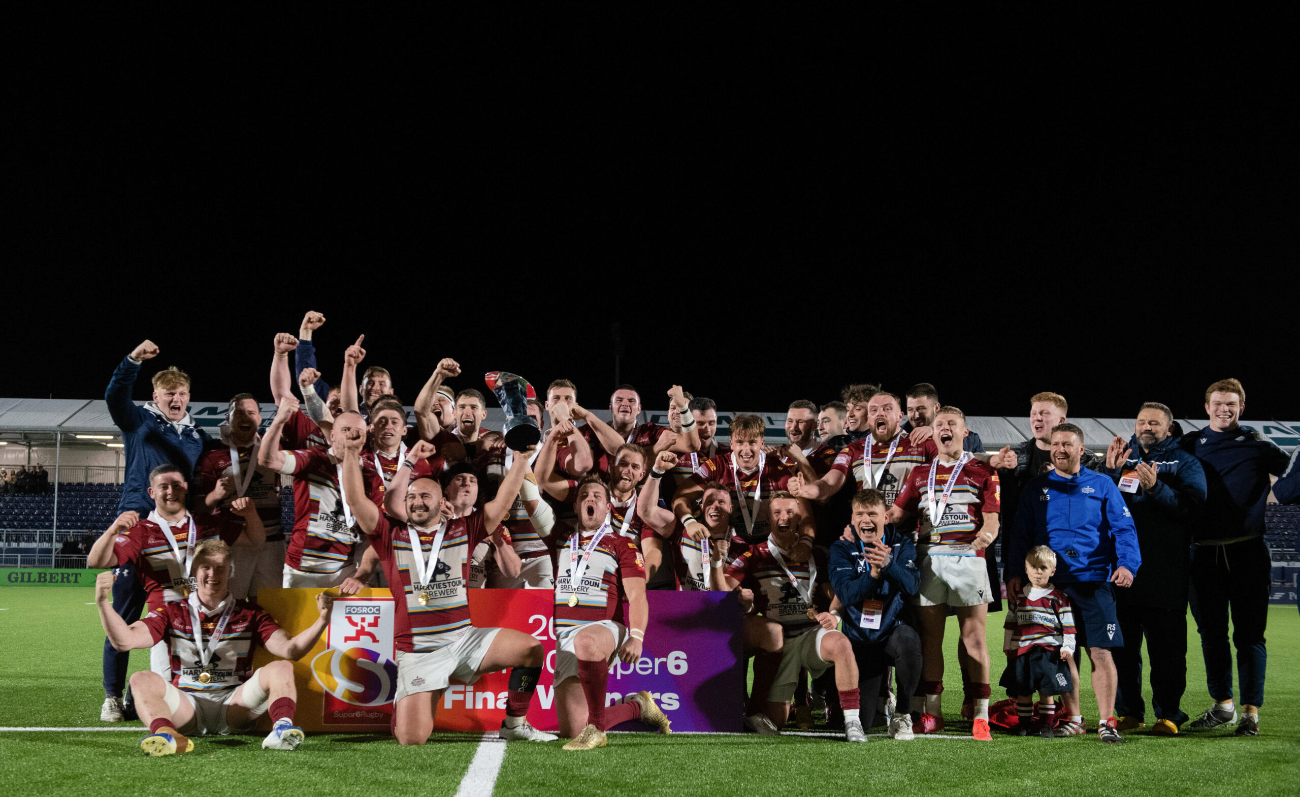EDINBURGH, SCOTLAND - OCTOBER 30: Watsonians lift the Super6 Trophy during the FOSROC Super6 Final match between Watsonians and Ayrshire Bulls at the DAM Health Stadium, on October 30, 2022, in Edinburgh, Scotland. (Photo by Ross Parker / SNS Group)