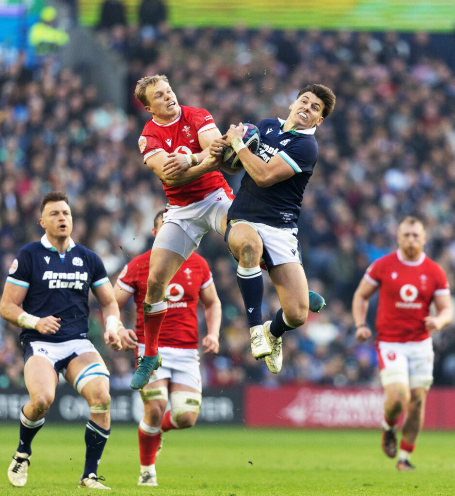 EDINBURGH, SCOTLAND – MARCH 08: Scotland’s Tom Jordan and Wales Blair Murray in action during a Guinness Six Nations match between Scotland and Wales at Scottish Gas Murrayfield, on March 08, 2025, in Edinburgh, Scotland. (Photo by Ross MacDonald / SNS Group)