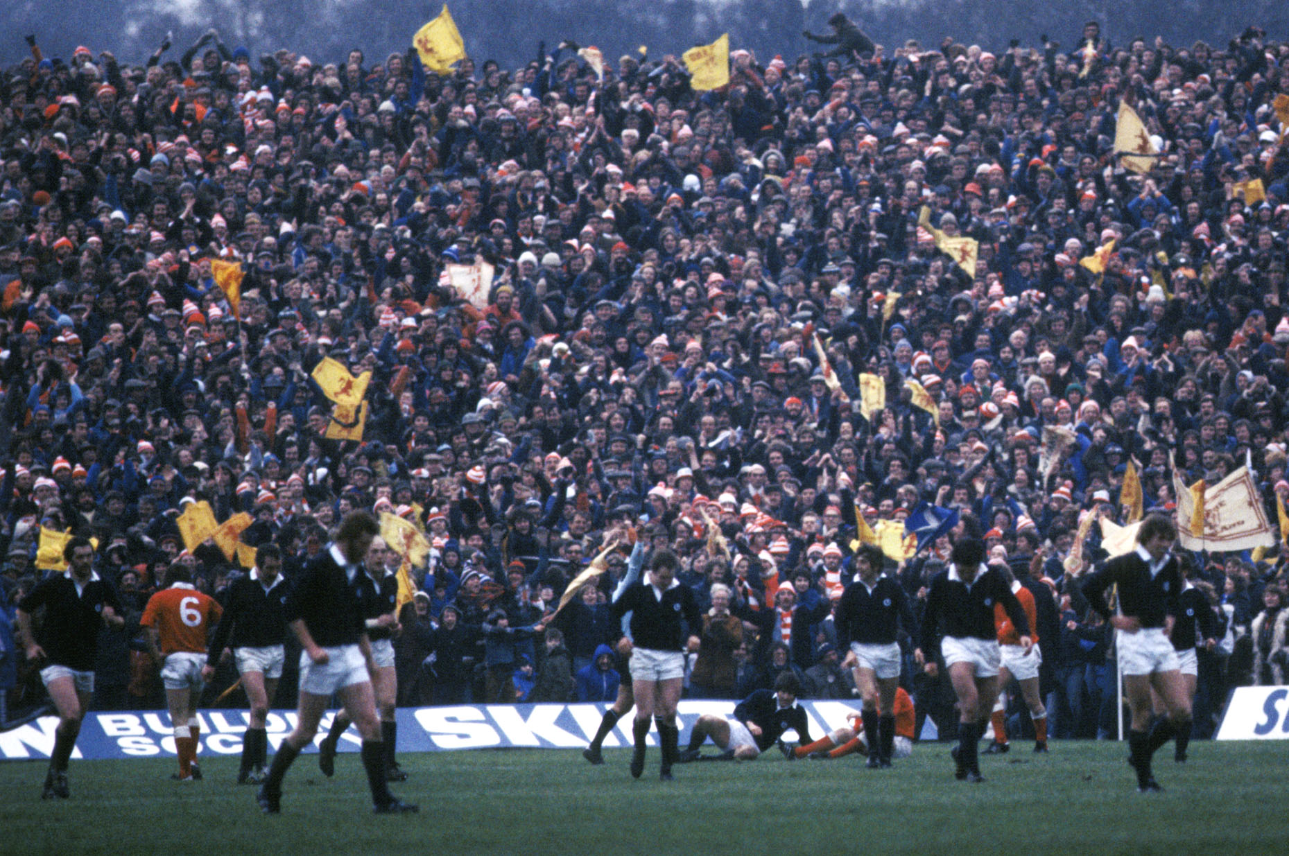 The Scotland fans celebrate Andy Irvine's try.