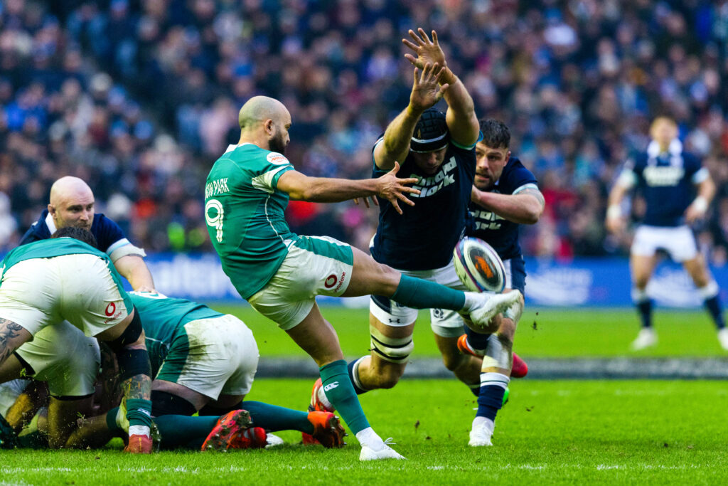 EDINBURGH, SCOTLAND – FEBRUARY 09: Scotland’s Jonny Gray closes down Ireland’s Jamison Gibson-Park during a Guinness Six Nations match between Scotland and Ireland at Scottish Gas Murrayfield, on February 09, 2025, in Edinburgh, Scotland. (Photo by Craig Williamson / SNS Group)