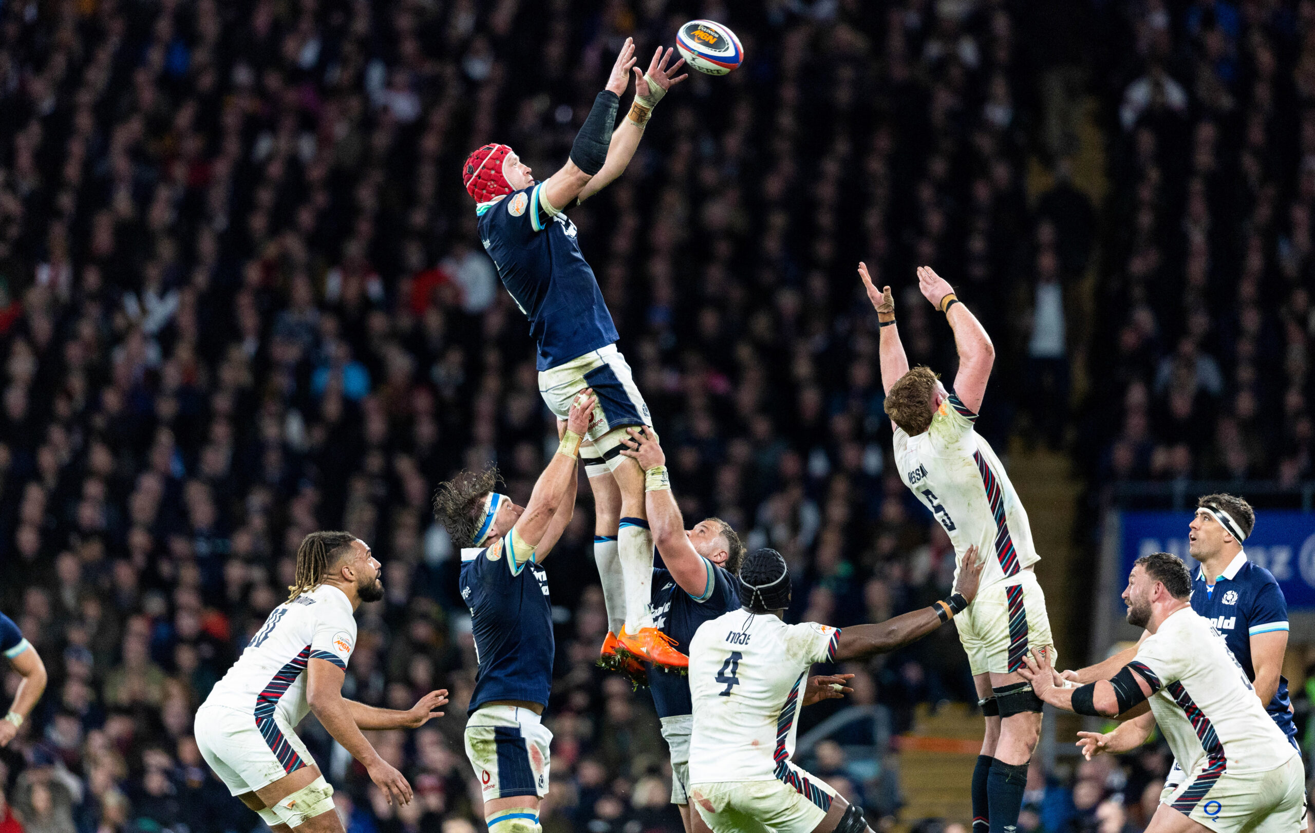 LONDON, ENGLAND - FEBRUARY 22: Scotland's Grant Gilchrist at a lineout during a Guinness Six Nations match between England and Scotland at Allianz Stadium, Twickenham, on February 22, 2025, in London, England. (Photo by Ross MacDonald / SNS Group)