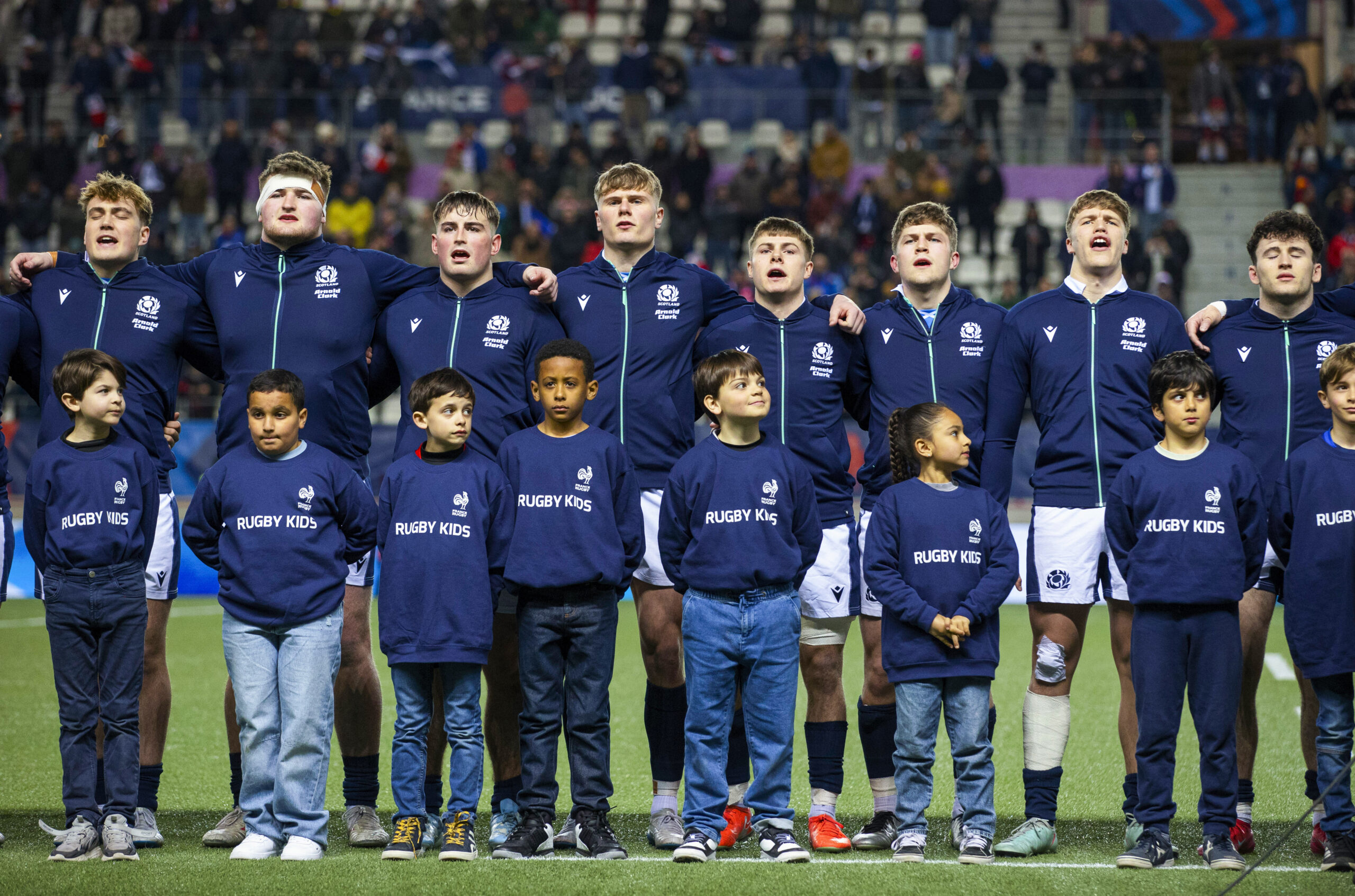 PARIS, FRANCE - MARCH 14: The Scotland squad during the national anthems during an Under-20s Six Nations match between France and Scotland at the Stade Jean-Bouin, on March 14, 2025, in Paris, France. (Photo by Craig Williamson / SNS Group)
