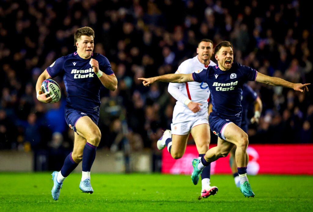 On a sun-drenched afternoon at Scottish Gas Murrayfield, Scotland faced France in a top-of-the-table clash. In just the fifth minute of the game a ball fumbled but quickly recovered by Finn Russell was shifted to Darcy Graham who had made the effort to come across the pitch and hit a hard line from deep. Graham sliced through the French defence and outstripped the chasing Louis Bielle-Biarrey to cross the whitewash for international try number 36, becoming the all-time leading try scorer for the Scotland Men’s team. Later that same afternoon Graham extended his tally with a customarily shifty finish, beating three French defenders to score his 37th international try.