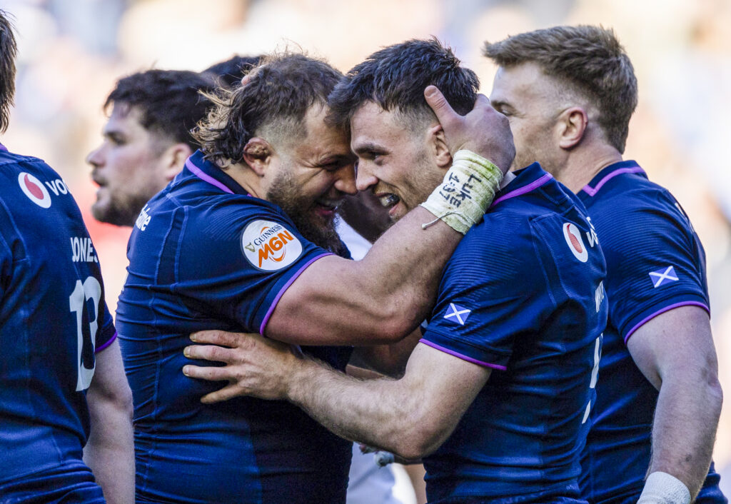 EDINBURGH, SCOTLAND – MARCH 07: Scotland’s Ben White (R) celebrates scoring his side’s fourth try with teammate Pierre Schoeman during a Guinness Six Nations match between Scotland and France at Scottish Gas Murrayfield.