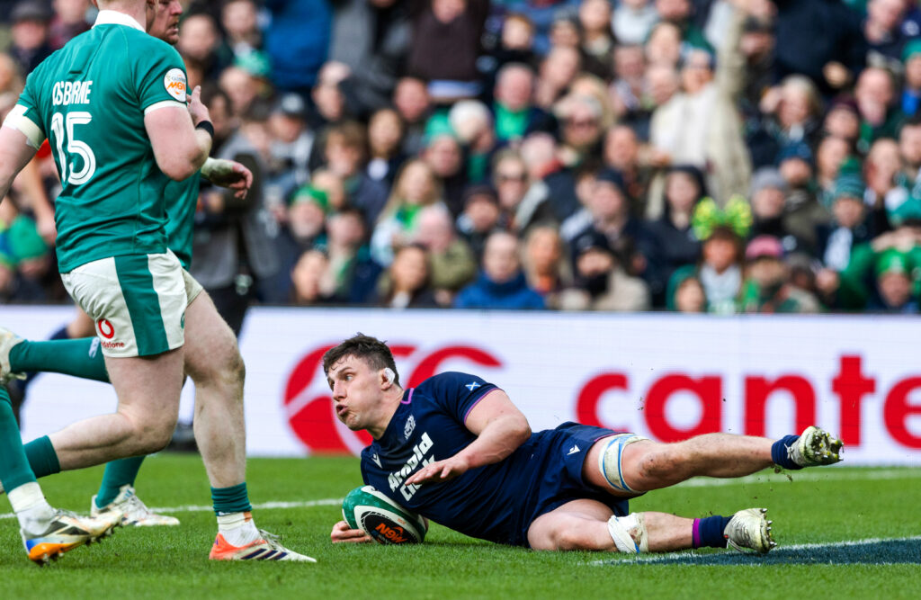 DUBLIN, IRELAND – MARCH 14: Scotland’s Rory Darge scores his sides third try of the match during a Guinness Six Nations match between Ireland and Scotland at the Aviva Stadium.