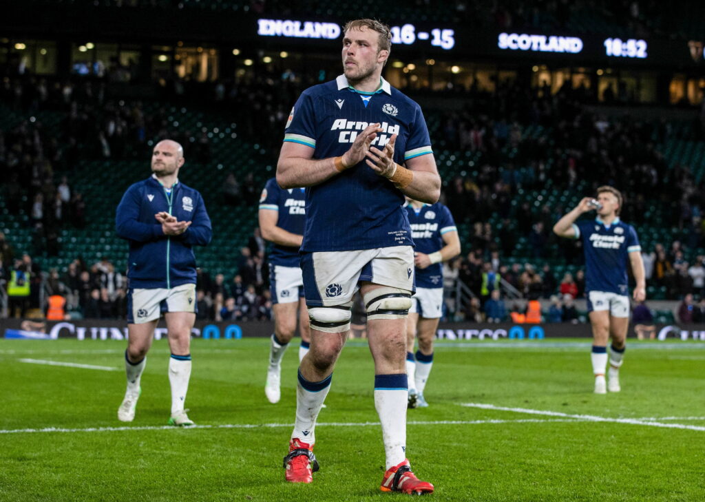 LONDON, ENGLAND – FEBRUARY 22: Scotland’s Jonny Gray at full time during a Guinness Six Nations match between England and Scotland at Allianz Stadium, Twickenham, on February 22, 2025, in London, England.