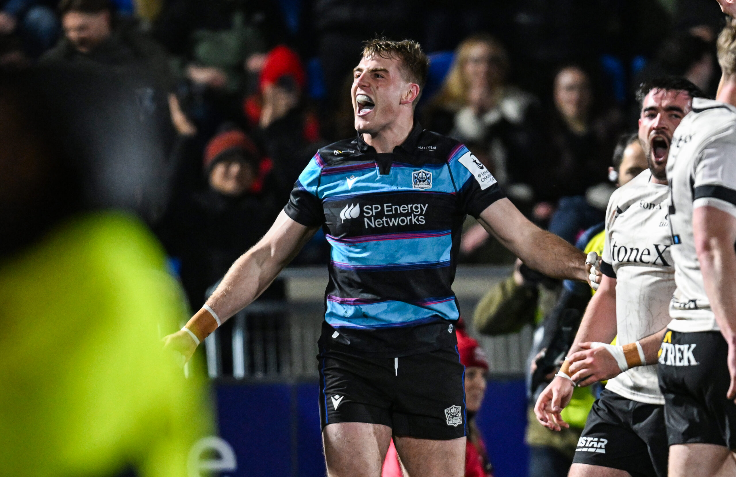 GLASGOW, SCOTLAND - JANUARY 18: Warriors' Stafford McDowall celebrates after Seb Stephen scores a second half try during a 2025/26 Investec Champions Cup Round 4 match between Glasgow Warriors and Saracens at Scotstoun Stadium, on January 18, 2026, in Glasgow, Scotland. (Photo by Rob Casey / SNS Group)
