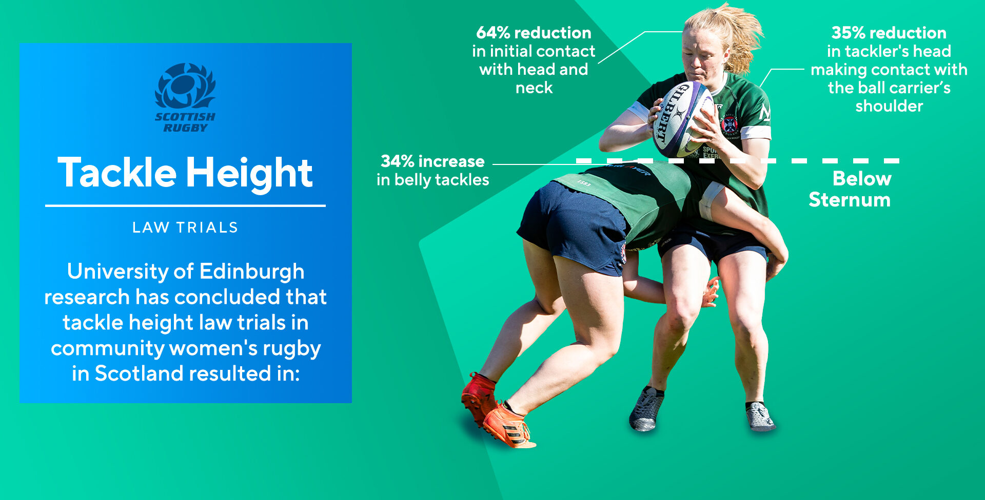 Changes to the tackle height law in women’s community rugby in Scotland is linked to reductions in head-to-head and head-to shoulder contacts, the study found.