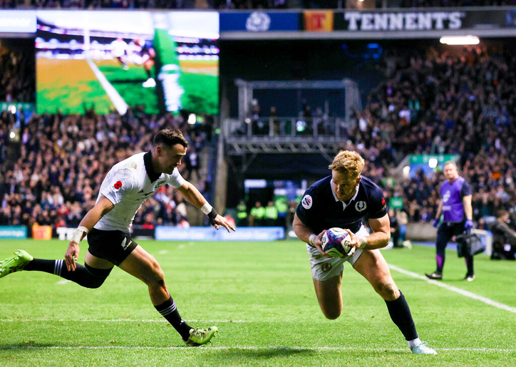 Kyle Steyn scores against the All Blacks at Scottish Gas Murrayfield last November