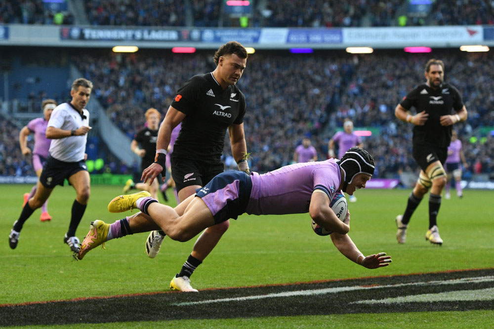 Darcy Graham scores against the All Blacks at Scottish Gas Murrayfield in 2022